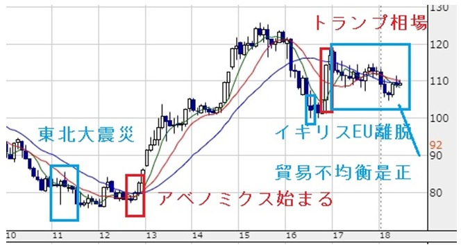 2011年に東北大震災が起きて1ドル80円を切る超円高になります。この状況は約二年間続きますが、2012年末に政権交代が起きて、いわゆる「アベノミクス」が始まります。