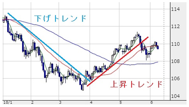 年初から3月まではずっと円高になり、1ドル105円をつけたところで底入れしています。あとは円安に流れが変わり110円まで戻しています。為替相場にはいろんな思惑や予想があってなかなか動きが捉えにくいですが、このようにチャートで見るとひと目でわかります。