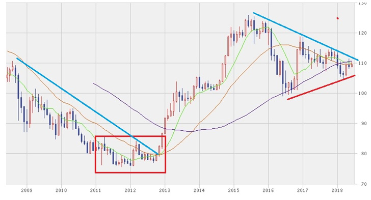2018年6月現在1ドル110円付近ですが、円高、円安両方向に強弱感は対立しています。円高になれば再び100円方向に行くでしょう。