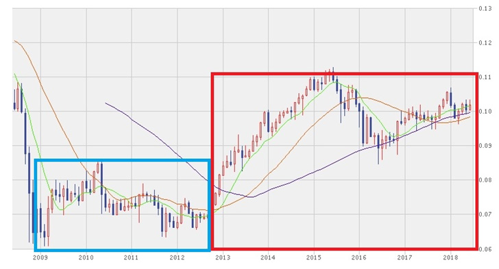 2009年から2012年半ばまで円高でしたが、韓国ウォンとの関係でもかなりの円高が続いています。